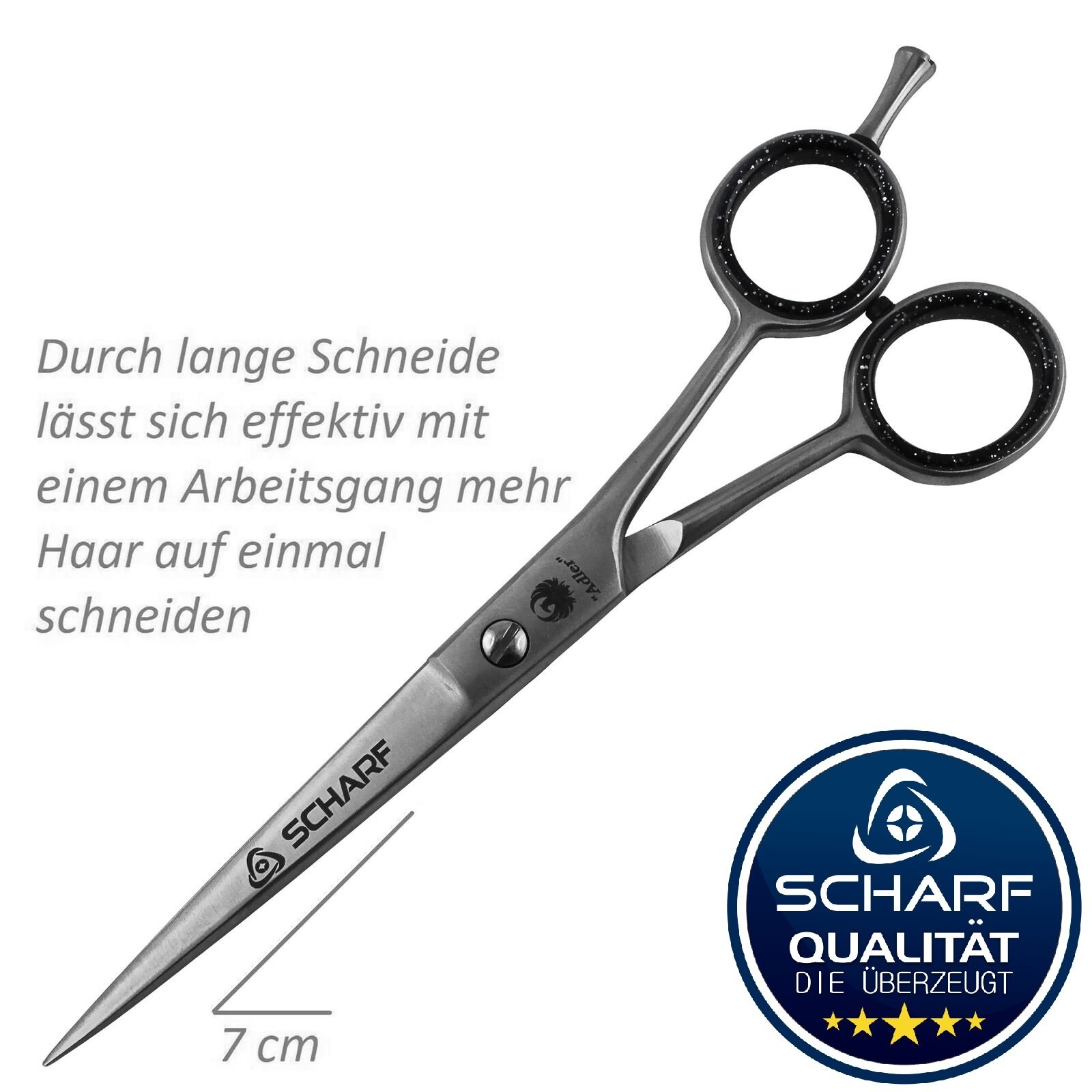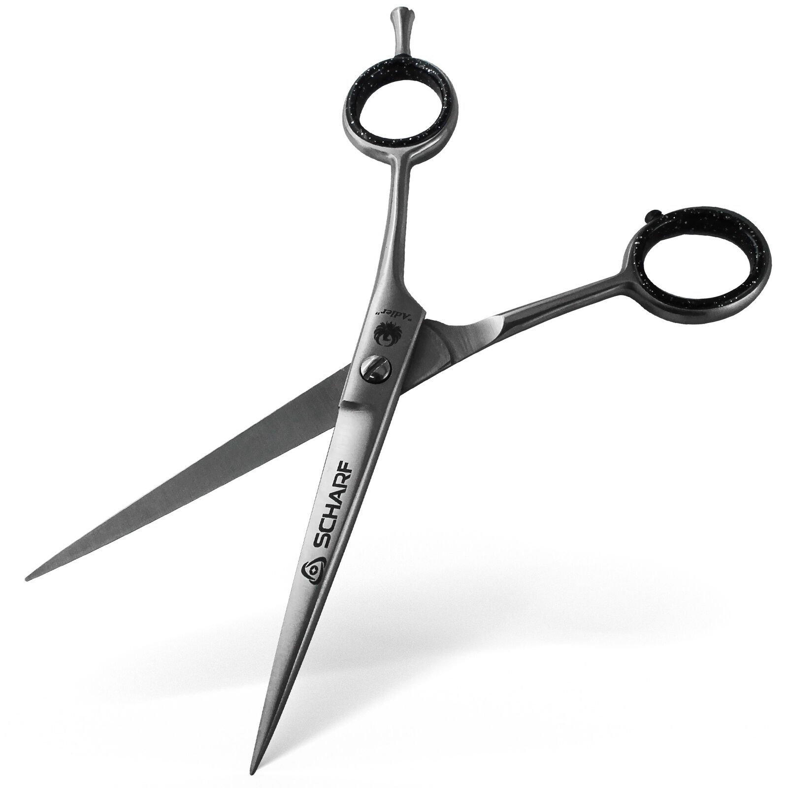 Hochqualitatives Grundmaterial, einen formvollendeten Schliff, Handlichkeit, ausbalancierte Gewichtsverteilung und Präzision. Die leichtgängigen Schneidblätter verfügen über eine einseitige Mikroverzahnung, diese sorgt für perfekten Halt und garantiert einen exakten Schnitt. Die Gängigkeit lässt sich an ihre Bedürfnisse anpassen, während der wechselbare Fingerhaken für perfekte Handhabung und Führung sorgt. Zusätzlich sorgen herausnehmbare Gummiringe im Scherenauge für Rutschfestigkeit. Zur Geräuschminimierung beim Schließen der Schere ist ein Soft- Stopper vorhanden. Die Schere ist neben Privatanwendung auch ideal für Auszubildende des Friseurhandwerks.