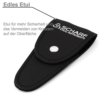 - Edles Etui – Hochwertige Produkte müssen auch angemessen verpackt sein. Daher liefern wir unsere Schere stets in einem Etui für mehr Sicherheit und das Vermeiden von Kratzern auf der Oberfläche. Ob in der Handtasche, im Kulturbeutel oder auch Zuhause, Ihre Nagelschere bleibt stehts geschützt.